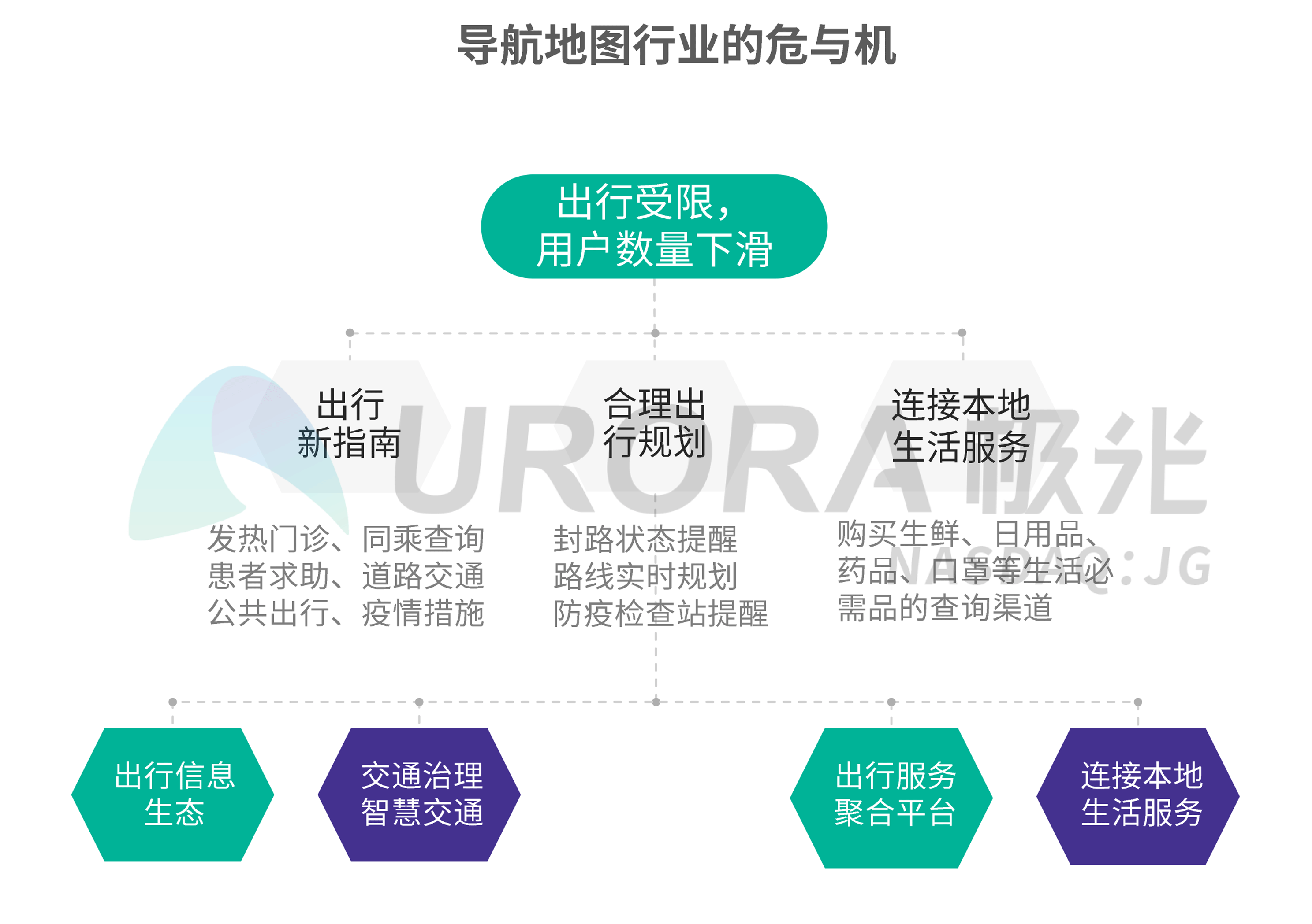 疫情之下,导航地图行业出现用户数量下滑的现象;作为用户日常出行规划和交通导航的应用,导航地图类app在特殊时期也火速上线疫情防控相关功能模块;危机中显现的作用正好体现了导航地图类app的价值内核,比如成为出行相关垂直领域的信息入口的作用,基于地理位置的生活服务连接,以及基于大数据分析的道路规划等方面