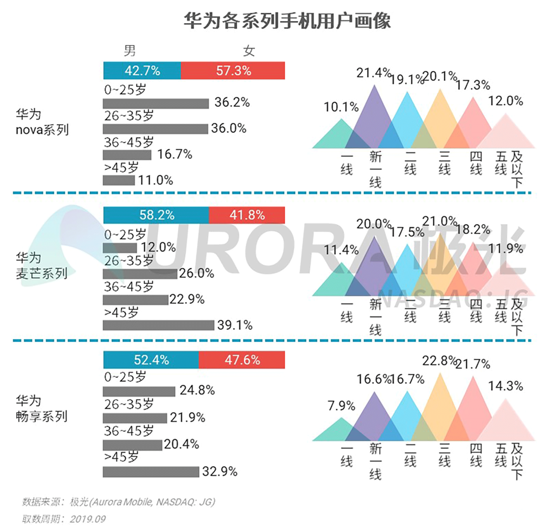 华为nova系列女性用户占比高,麦芒系列45岁以上中老年用户占比高,畅享系列下沉市场用户占比高