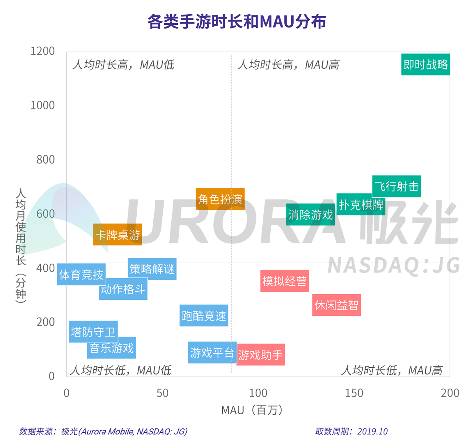 • 角色扮演和卡牌桌游虽然人均使用时长高,但 MAU 不高,而模拟经营和休闲益智类游戏虽然 MAU 比较高,但人均时长较低,并未能吸引用户长时间使用
