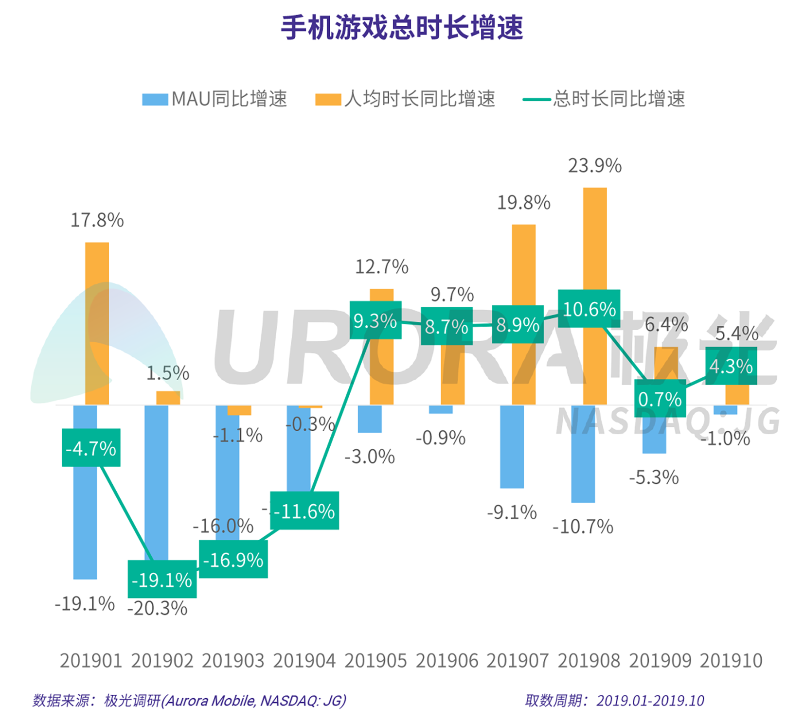 • 手游总时长主要受 MAU 和人均时长影响,MAU 在2019年整体处于下滑趋势之中,特别是1-4月下滑明显,带动手游总时长在同期同比下滑