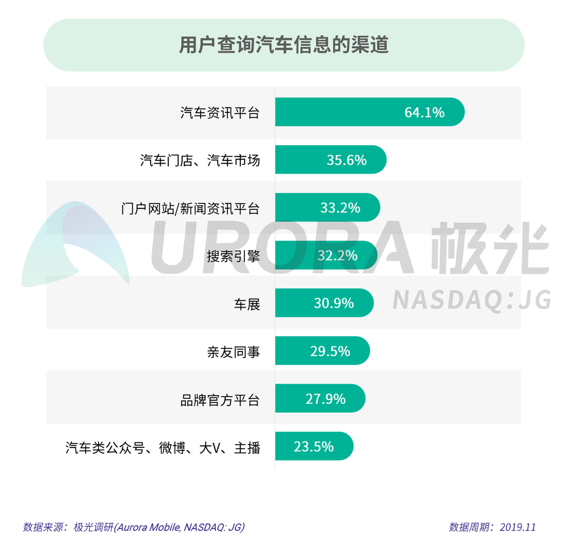 • 64.1%的用户在查询汽车信息时选择汽车资讯平台,其次是汽车门店、汽车市场;选择从汽车类公众号、微博等平台获取汽车资讯的人占比最少