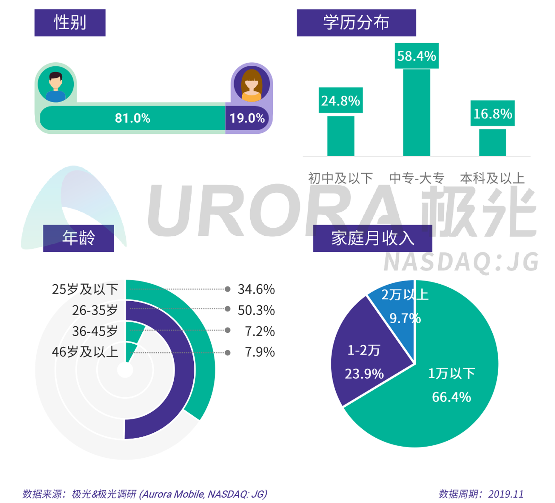 报告说明 1.数据来源 1)极光 (Aurora Mobile, NASDAQ:JG),源于极光云服务平台的行业数据采集及极光iAPP平台针对各类移动应用的长期监测,并结合大样本算法开展的数据挖掘和统计分析;2)极光调研数据,通过极光调研平台进行网络调研,总样本数:319;3)其他合法收集的数据。以上均系依据相关法律法规,经用户合法授权采集数据,同时经过对数据脱敏后形成大数据分析报告。 2.数据周期 报告整体时间段: 2018年11月- 2019年11月。 3.数据指标说明 具体数据指标请参考各页标注。 4.免责声明 极光JIGUANG所提供的数据信息系依据大样本数据抽样采集、小样本调研、数据模型预测及其他研究方法估算、分析得出。由于统计分析领域中的任何数据来源和技术方法均存在局限性,极光JIGUANG也不例外。极光JIGUANG依据上述方法所估算、分析得出的数据信息仅供参考,极光JIGUANG不对上述数据信息的精确性、完整性、适用性和非侵权性做任何保证。任何机构或个人援引或基于上述数据信息所采取的任何行动所造成的法律后果均与极光JIGUANG无关,由此引发的相关争议或法律责任皆由行为人承担。 5.报告其他说明 极光数据研究院后续将利用自身的大数据能力,对各领域进行更详尽的分析解读和商业洞察,敬请期待。 6.版权声明 本报告为极光JIGUANG所作,报告中所有的文字、图片、表格均受相关的商标和著作权的法律所保护,部分内容采集于公开信息,所有权为原著作者所有。未经本公司书面许可,任何组织和个人不得以任何形式复制或传递。任何未经授权使用本报告的相关商业行为都将违反《中华人民共和国著作权法》和其他法律法规的规定。