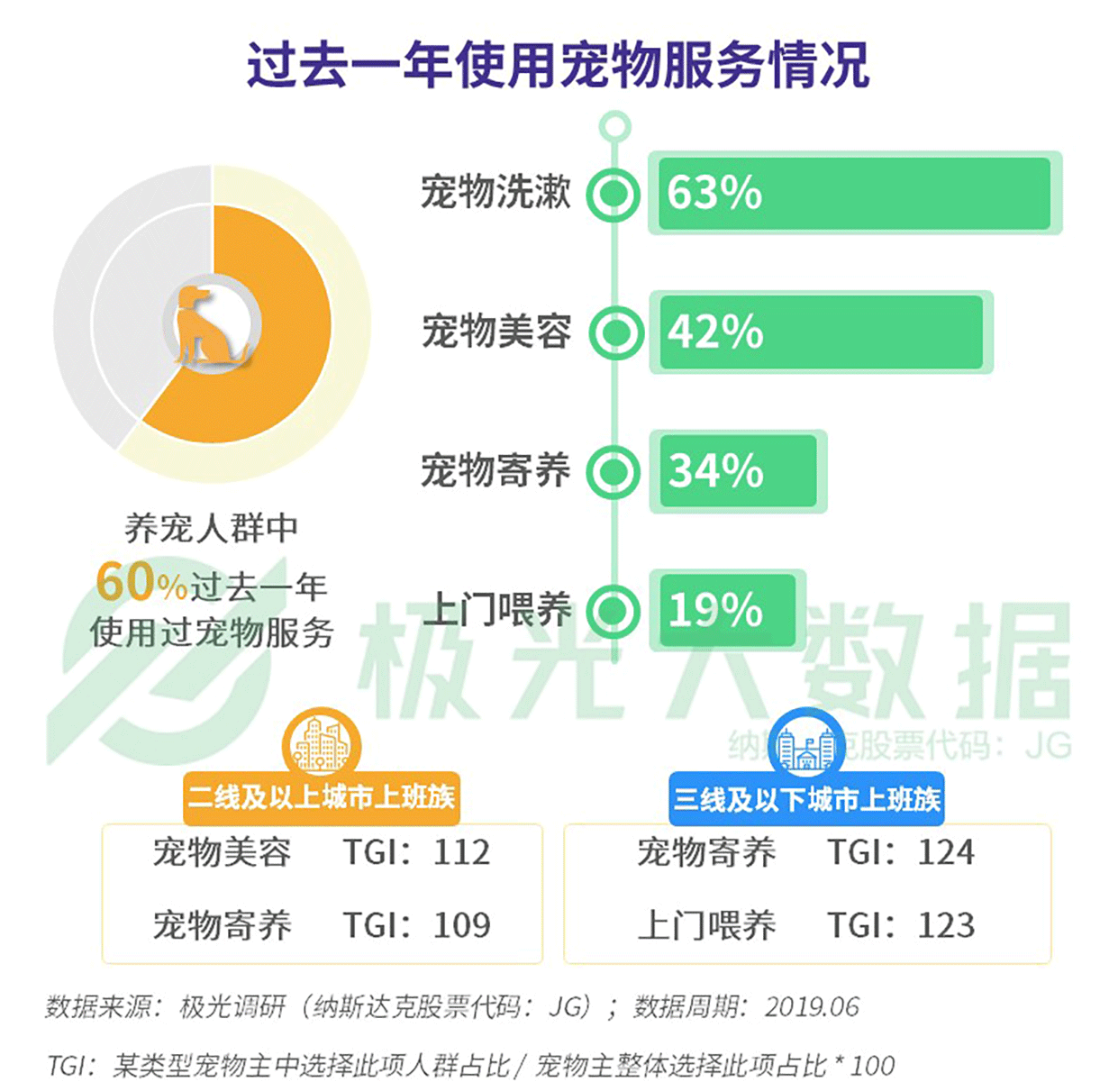 • 六成宠物主过去一年使用过宠物服务,其中宠物洗漱和宠物美容服务最受欢迎