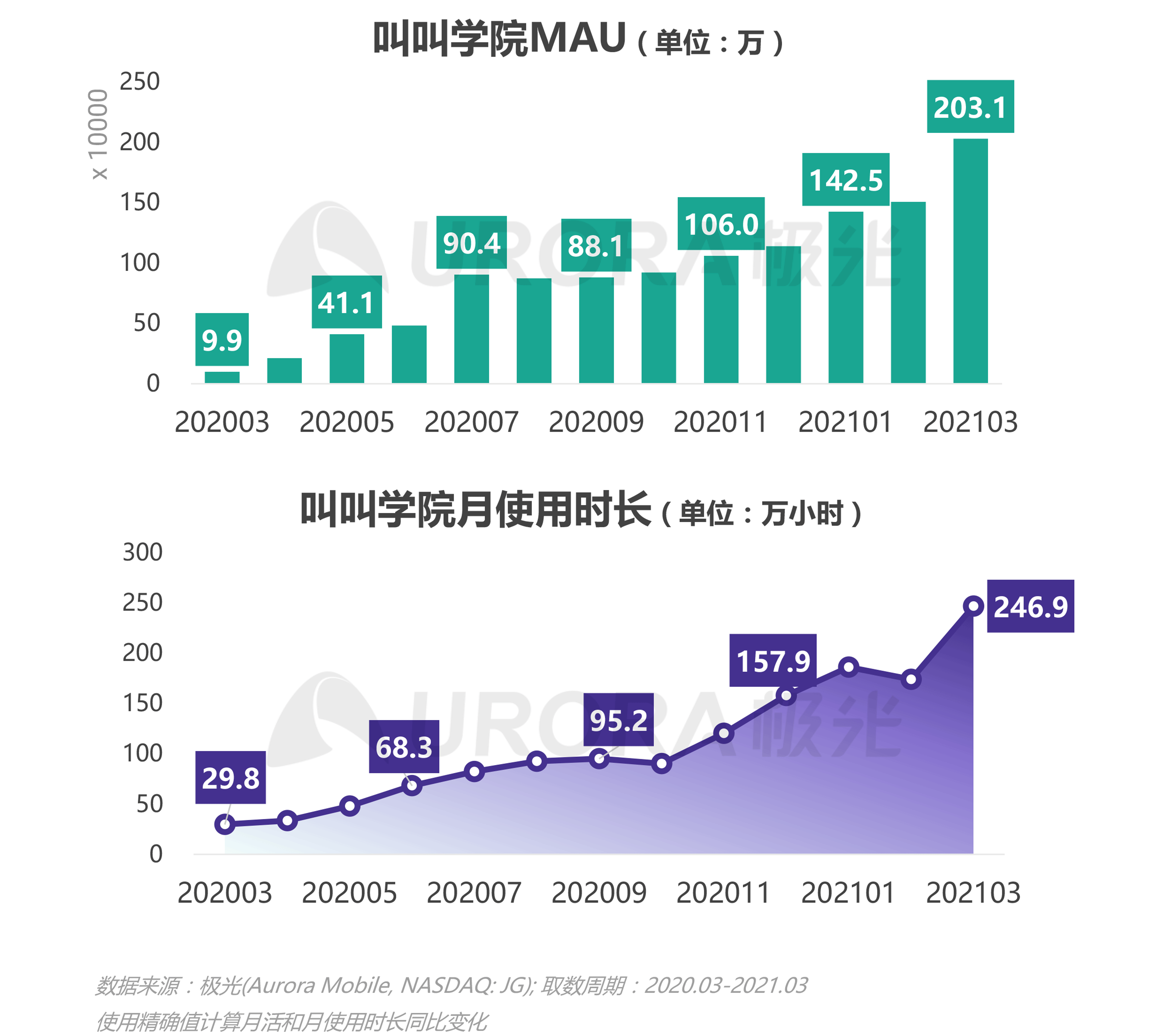 叫叫学院研发一系列阅读课程,致力于激发3-12岁孩子的阅读兴趣和提高表达能力,截至2021年3月,用户的月总使用时长近247万小时,同比增速为729%