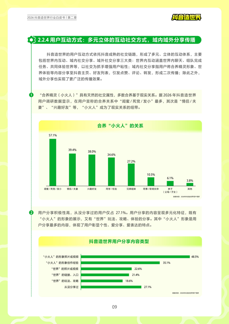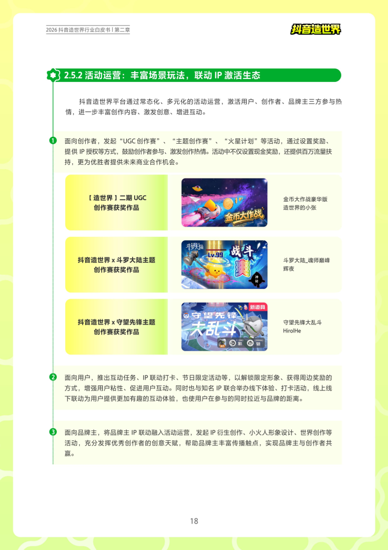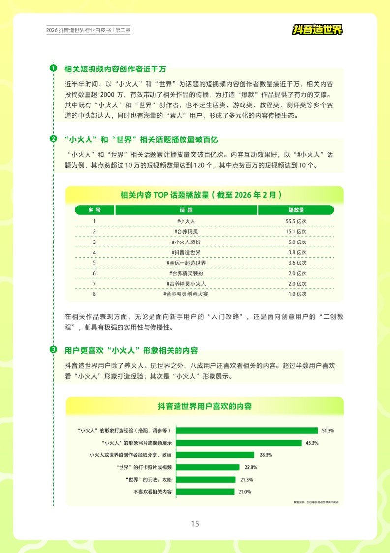 2026年3月7日,抖音造世界联合极光月狐发布了《2026抖音造世界行业白皮书》。梳理了国内市场UGC创作生态的整体现状、各个细分赛道的发展概况、以及抖音造世界在新赛道UGC互动社区中的成长表现。报告围绕抖音造世界生态的四个核心环节展开,包括:用户需求及行为偏好,各类创作者发展现状,品牌及IP合作模式,平台技术、流量、商业赋能等,为创作者和品牌主提供参考。总体来看,抖音造世界生态正处于高速发展阶段,凭借其生态优势,为创作者提供低门槛、高潜力、高价值的内容创作空间,实现用户、创作者、品牌主共赢。