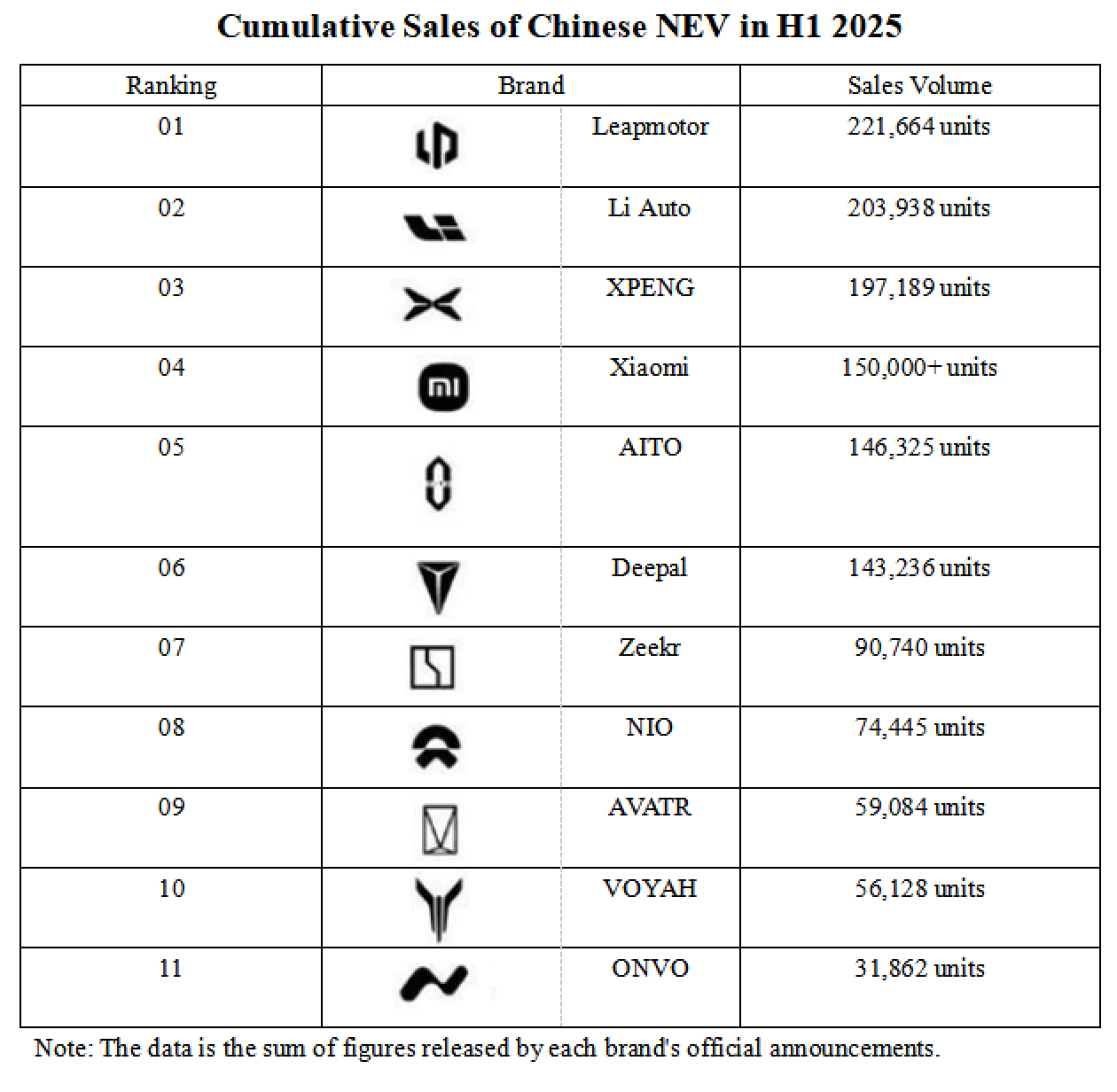 With 221,664 units sold in the first half of 2025, Leapmotor led all NEV brands and maintained its No. 1 position for four consecutive months. Li Auto ranked second with 203,938 units, followed by XPENG Motors in third place with 197,189 units.