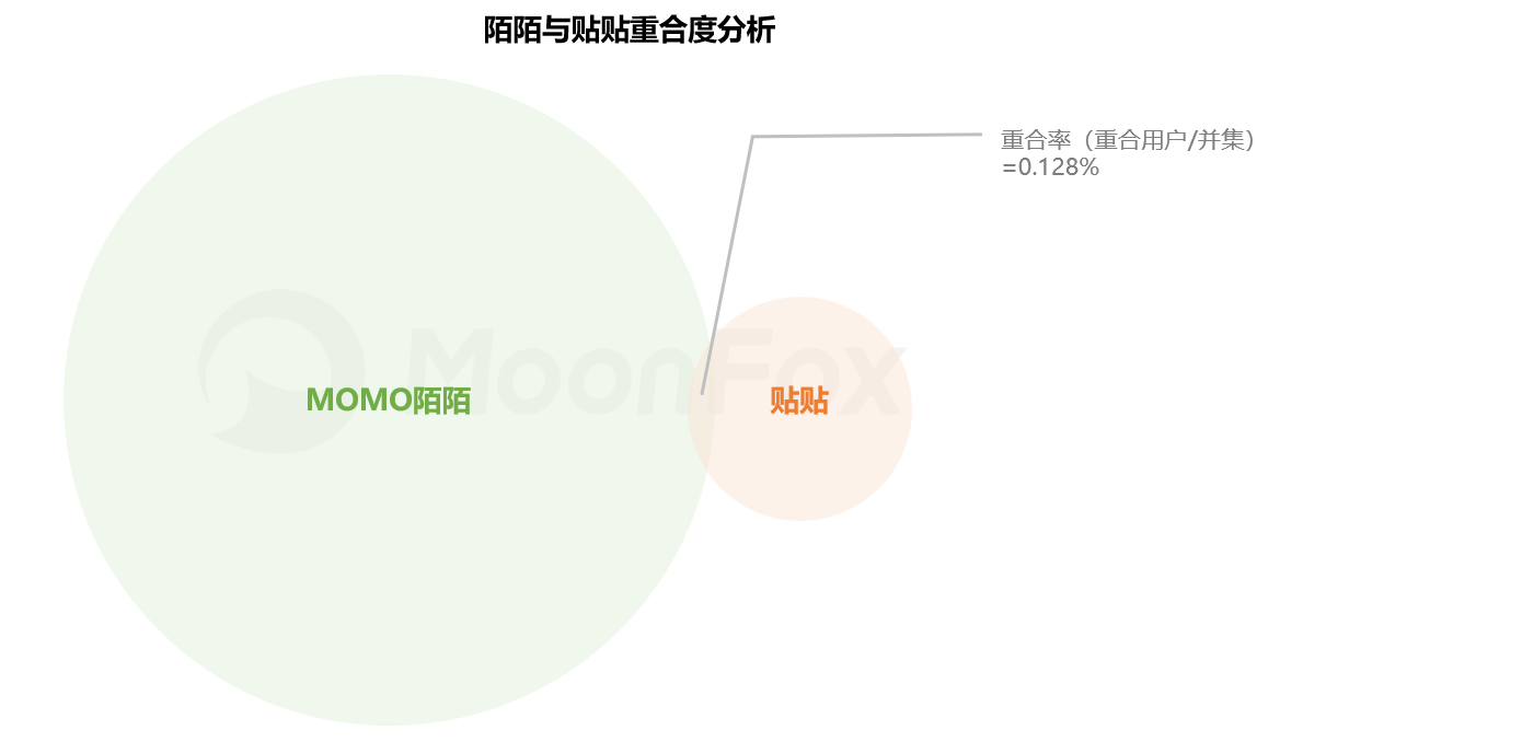 月狐数据发现,贴贴和陌陌的重合人群占比很小。他们的目标人群也是不同的,贴贴是与密友一起分享使用的APP,而陌陌是陌生人之间的交友软件。