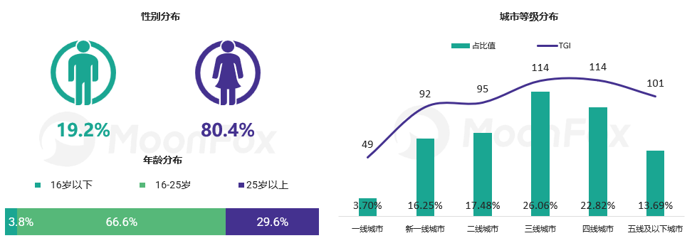 贴贴的用户多为处于高中到大学的年轻女性,并且大部分来自于三、四线城市。