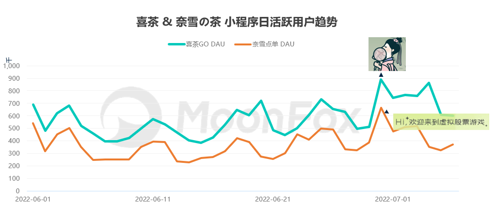 6月30日,喜茶在小程序“喜茶GO”推出《梦华录》联名饮品:梦华茶喜·点茶、紫苏·粉桃饮。并同时在广州天环广场LAB店、成都宽窄巷子店、北京前门大街店、深圳京基KK MALL店共四家门店特别设置为【喜·半遮面】主题店。当天也是奈雪の茶上市一周年的纪念日,奈雪推出储值送现金券以及喝奈雪送虚拟股票的活动。