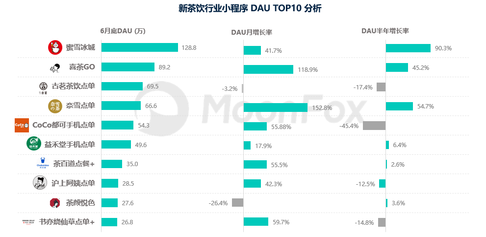 蜜雪冰城以其物美价廉的优势,占据庞大的下沉市场,位于排行榜第一的位置,且其DAU半年增长也是最高,可见其的强大的扩张实力。除了蜜雪冰城,竞争最激烈的就属喜茶和奈雪了,无论是月增长率还是半年增长率,都远超于大部分新茶饮品牌。这两者无论是在品牌影响力、产品创新力,还是产品营销力都属于该行业的佼佼者。