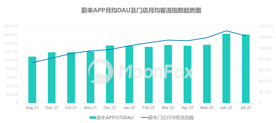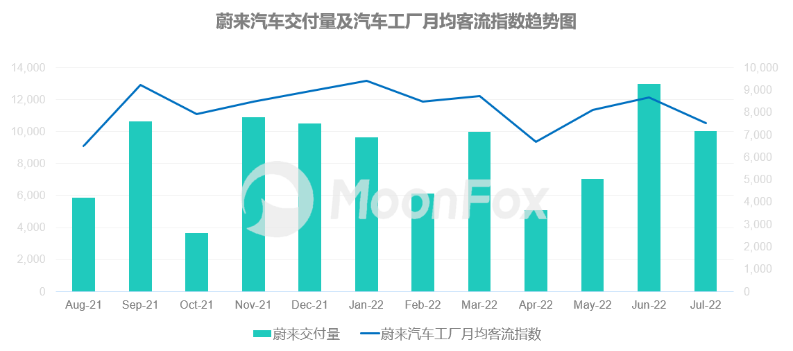 月狐数据同时发现,蔚来工厂的客流和每月的交付量呈正比的关系,蔚来APP的月均DAU与门店客流亦是如此。