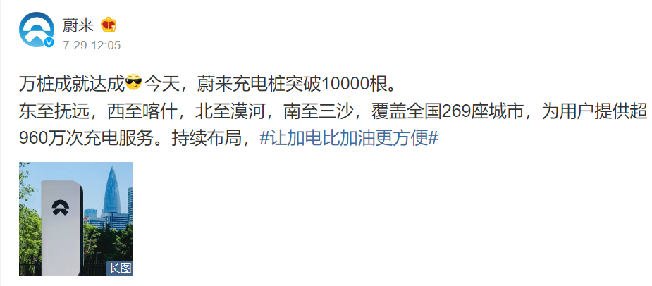 近期,随着蔚来深圳曙光科技大厦超充站投入运营,全国蔚来充电桩总数已突破10000根,覆盖269座城市。