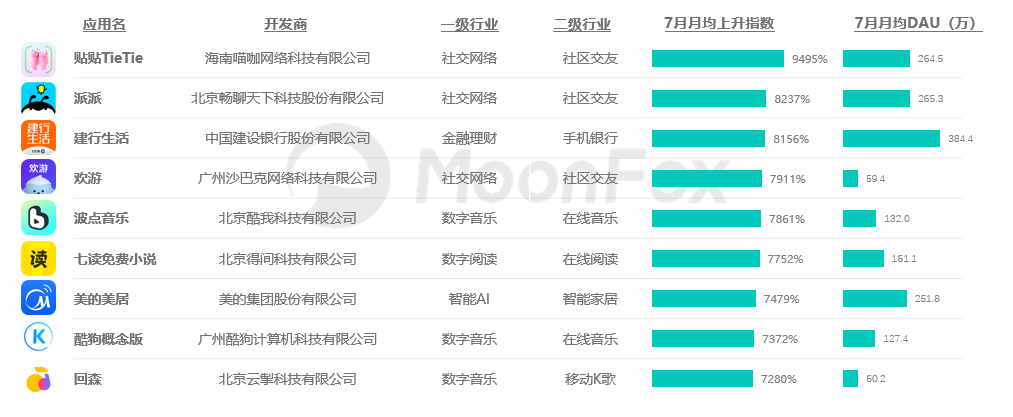 7月,有9个应用连续31天都上榜了“上升最快”,其中3个为社交网络行业APP,3个数字为音乐行业APP,其它3个APP分散在金融理财、数字阅读和智能AI行业。月均上升指数最高的是社区交友行业的贴贴,上升指数达9495%。