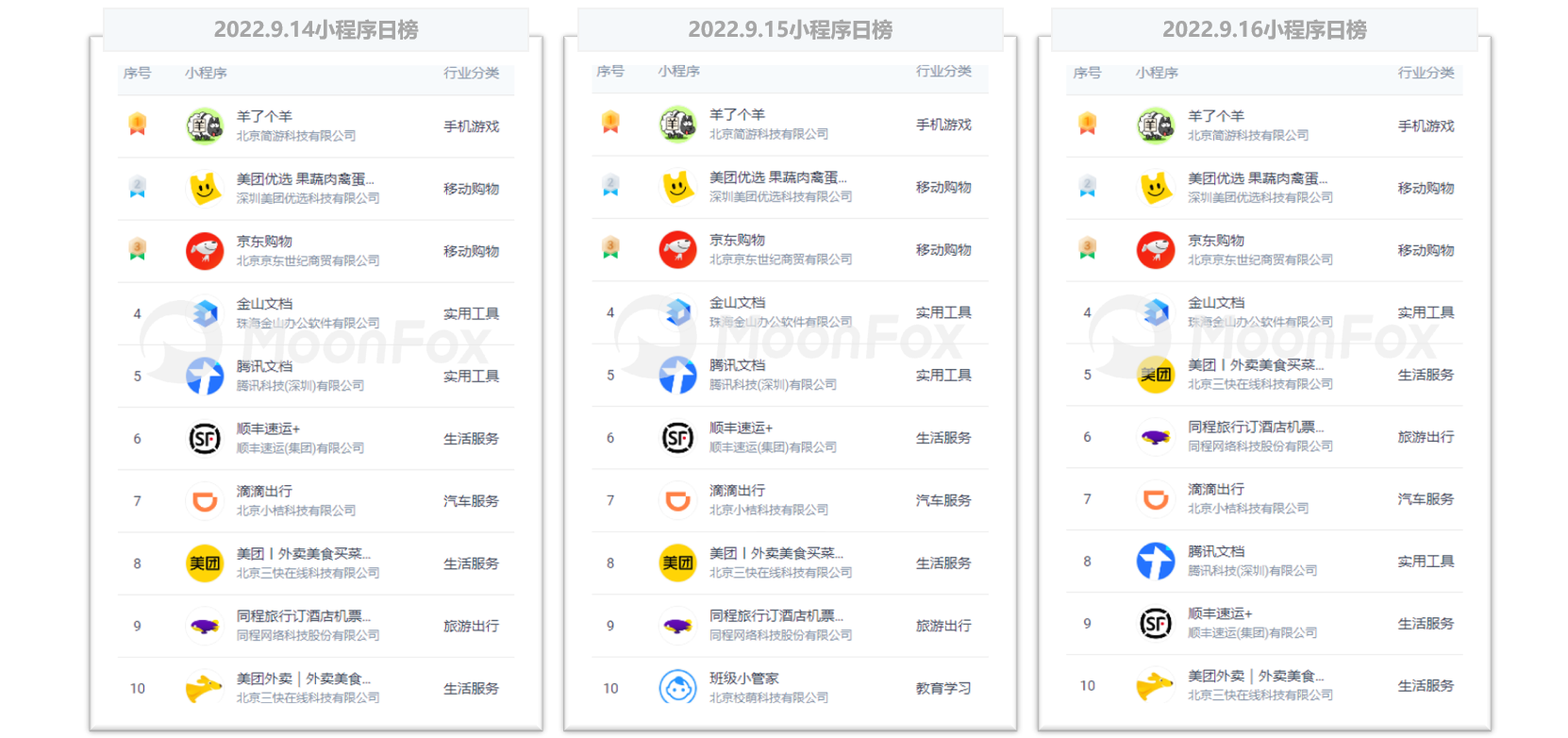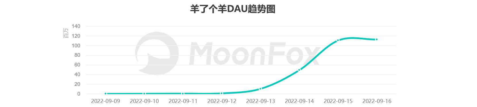 根据月狐数据,《羊了个羊》的DAU从12日开始呈指数式上升,并于15日突破1亿。14日-16日,《羊了个羊》连续三日登上小程序日榜榜首。
