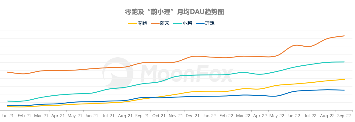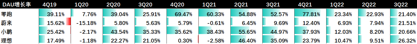 继一线造车新势力“蔚小理“成功上市后,9月29日,零跑在港交所正式上市,成为造车新势力第二梯队“第一股“。零跑近些年来表现一直不错,从交付量来看,零跑从2022年3月开始已经有超“蔚小理“的势头了;从DAU增长来看,零跑19年Q4以来一直都保持增长的趋势 ,且从20年Q3开始连续6个季度DAU增长加速。