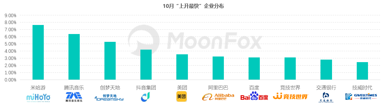 在国庆用户休闲娱乐的需求下,“米哈游”在10月跻身“上升最快”企业分布的第一名,旗下三款游戏(原神、云原神、崩坏3),一款社区APP(米游社)均有上榜。