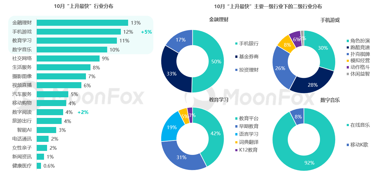 10月,金融理财、手机游戏、数字音乐等行业活跃用户提升明显。