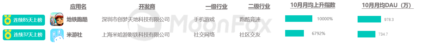 10月地铁跑酷再次进入整月上榜的名单,且10月均位居榜首,截止10月底已经连续85天上榜“上升最快”;