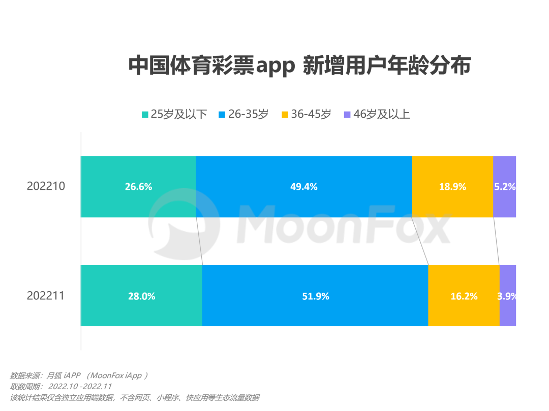 一句句网络爆梗的流行,让世界杯赛况受到来自年轻网民的热切关注,90后和00后正成为体彩彩民的新鲜血液。数据显示,中国体育彩票app在2022年11月的新增用户中,25岁及以下用户的比例与26-35岁用户的比例较10月的新增用户获得明显提升,分别为28%及51.9%,合计达到整体新增用户的八成。正如其他社交货币一样,购彩活动让年轻人在世界杯这一现象级事件中获得了参与感,猜中结果的兴奋或是爆冷倒灶的共鸣,都能成为年轻人在同龄圈子中的谈资。