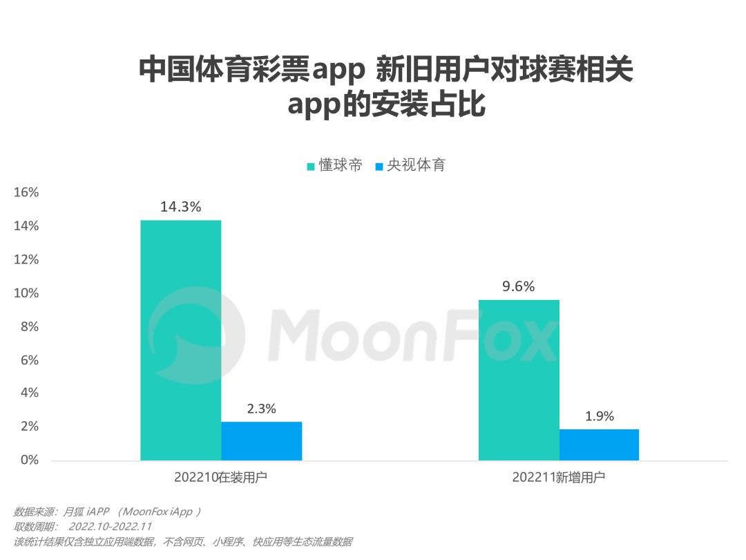 然而,这届“入坑”体彩的年轻人,似乎更享受于“只买不看”,对球赛过程的热衷程度不及老彩民。2022年10月已经安装了中国体育彩票app的老彩民,其在懂球帝和央视体育的安装占比分别为14.3%和2.3%;而到了2022年11月,新安装中国体育彩票app的新彩民对这两个app的安装占比则更低,分别为9.6%和1.9%。对于年轻的新彩民来说,也许具有吸引力的是购彩一刻的刺激与满足,至于是否需要通过视频直播和新闻资讯来了解足球知识和球赛数据、化身专业球迷,则显得不是十分必要了。