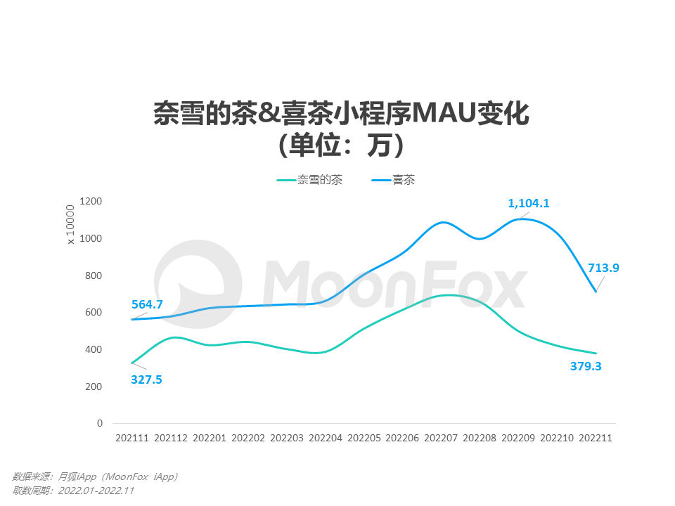 在现阶段下高端现制茶饮市场两大品牌的用户表现上,月狐数据显示,喜茶与奈雪的茶之间的差距仍在逐渐扩大:今年11月,奈雪点单小程序录得月活跃用户数379.3万,同比上升15.8%;而喜茶小程序11月MAU为713.9万,同比上升26.4%,其9月份更是录得超千万活跃用户。