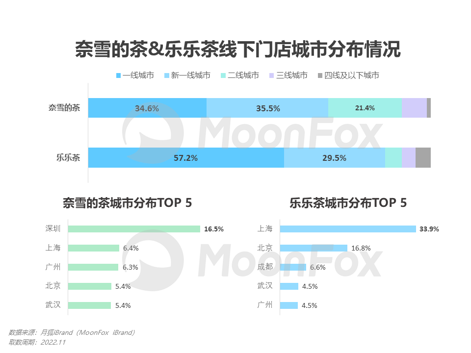 与喜茶加快下沉的策略不同,奈雪的茶有意通过并购同属高端茶饮的乐乐茶,提高该细分市场的集中度。月狐数据显示,乐乐茶一线城市的门店占比近六成,其中上海的门店数量占比33.9%,北京门店占比16.8%,一线城市地域和华东区域无疑是乐乐茶的主阵地。而奈雪自身的门店地域分布则较为平均,其一线城市、新一线城市和二线城市门店占比分别为34.6%,35.5%和21.4%。作为高消费力聚集的区域,上海市场的线下门店在奈雪的整体门店布局中占比仅为6.4%,因此对于奈雪而言,收购乐乐茶的一大利好是能快速强化其在上海乃至华东区域的渗透率, 奈雪期望通过补足上海市场的短板以扭转业绩。