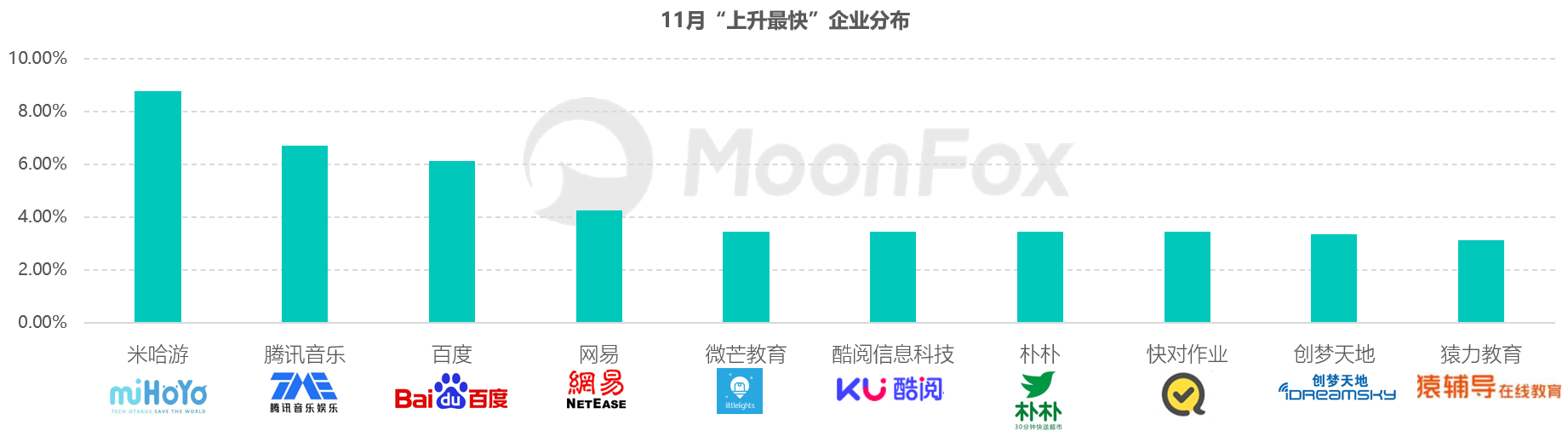 11月“上升最快”榜单的企业分布中,米哈游和腾讯音乐仍位居前二,朴朴跻进第七名。