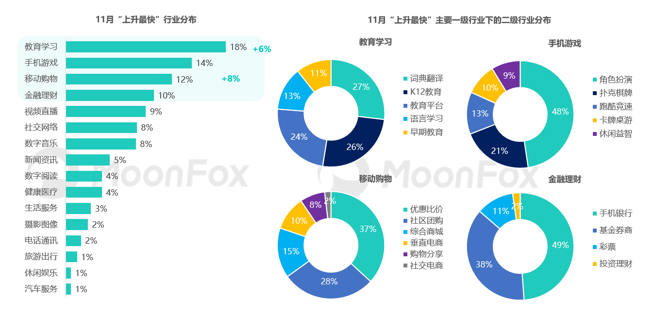 随着考试季的来临,以及“双十一”的消费刺激,教育学习行业及移动购物行业与上月相比活跃用户数上升明显。