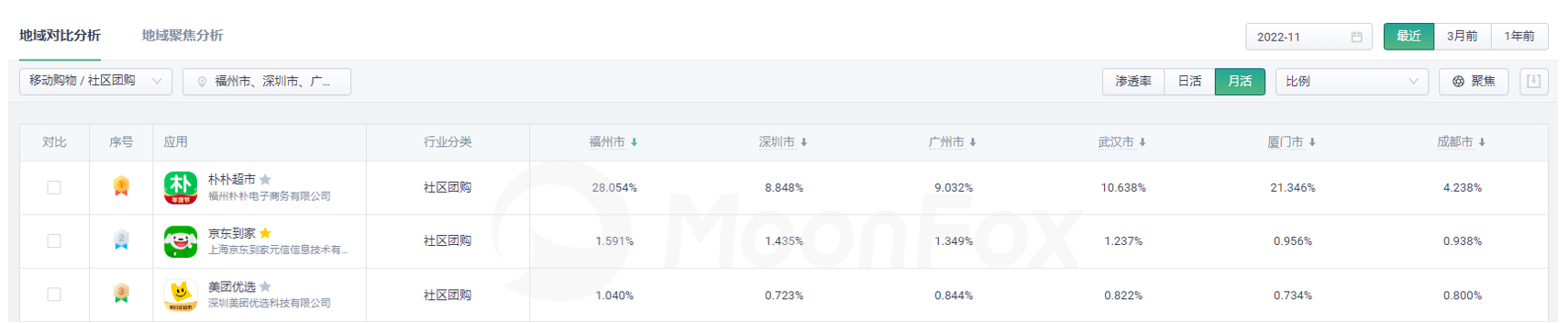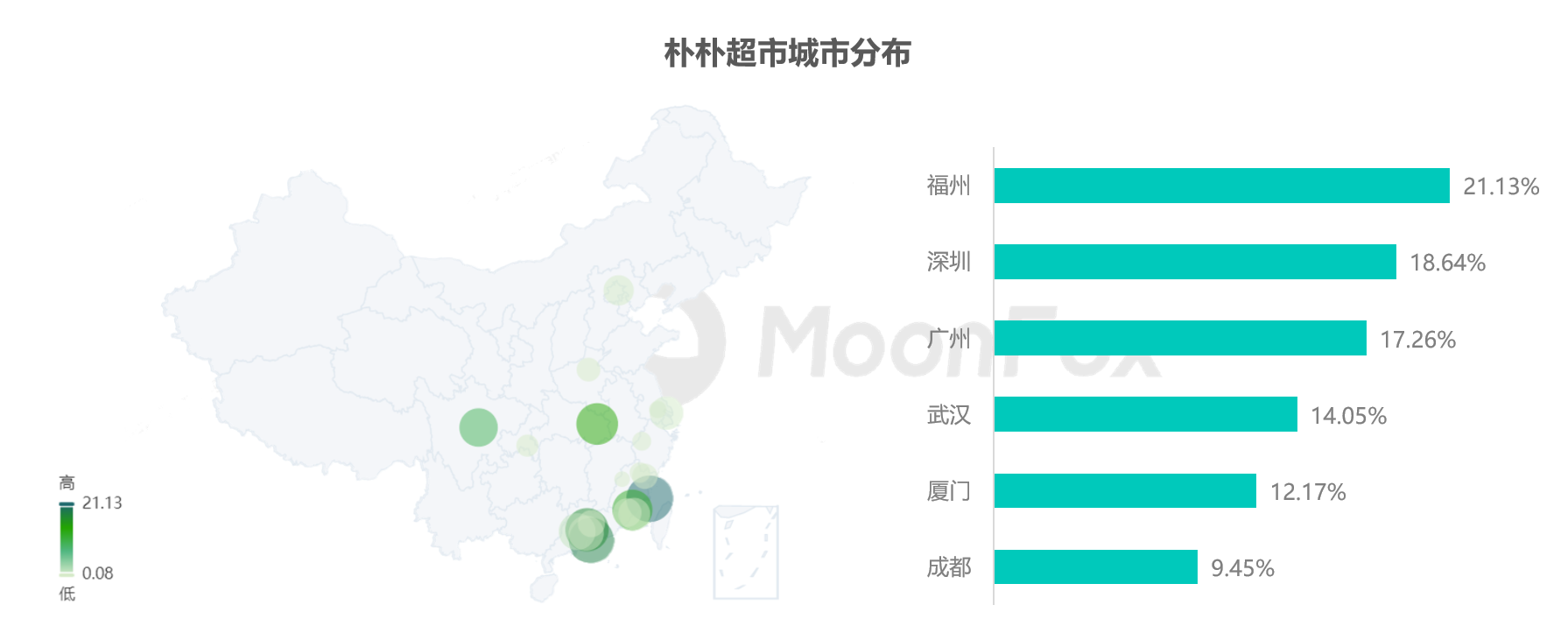 朴朴超市从福州起步,现已扩张到深圳、广州、武汉、厦门及成都,采用“纯线上+前置仓”的商业模式,达到30分钟内即时配送的效果。现已是这六个城市月活用户规模最大的社区团购平台。