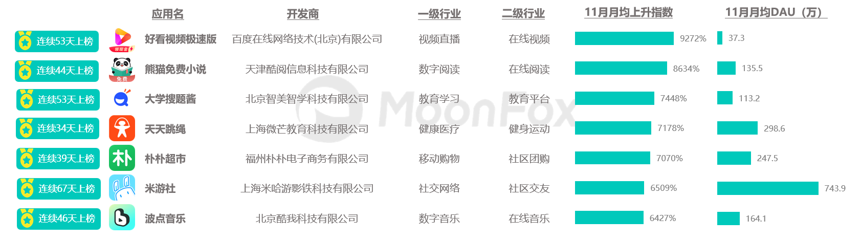 百度旗下的好看视频极速版在11月月均上升指数达9272%;
