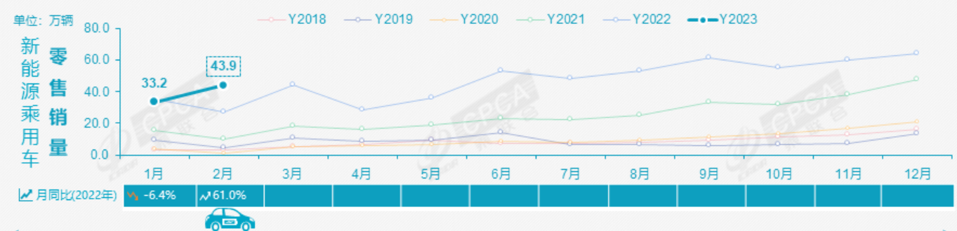 乘联会数据显示,2月新能源乘用车零售销量达到43.9万辆,同比增长61%,环比增长32.8%,2023年新能源车市开门红基本实现。