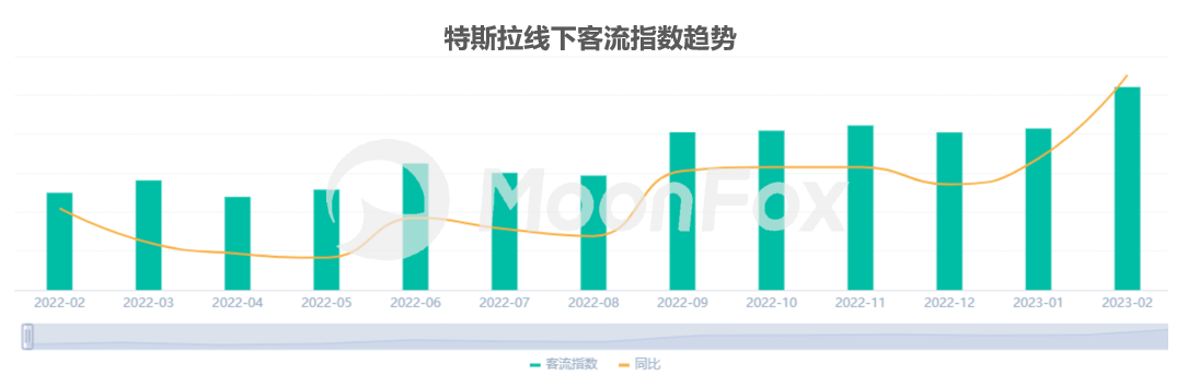 据月狐数据,主要5个新能源汽车品牌中,特斯拉线下门店客流指数的同比增长最快,达109%。