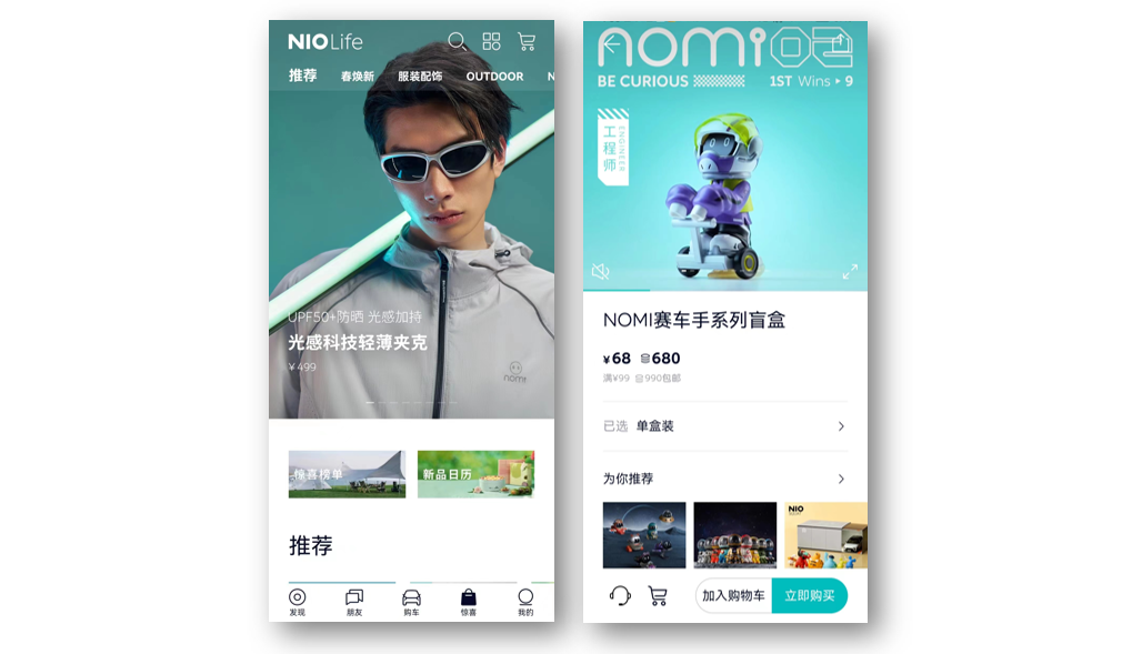 汽车属于高客单价,且极低频消费的品类。为了防止客户流失,提升复购率,蔚来开发了相对高频与高毛利的“周边衍生品商城”——惊喜,在惊喜中,用户可以通过钱或者蔚来积分来兑换产品,蔚来积分是面向全体用户的会员体系,可以通过购车或做任务(签到、分享等)方式获取。