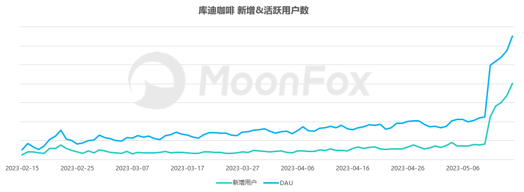 据月狐数据,自活动起,库迪咖啡官方APP的新增用户从稳步上涨到指数型上涨,活跃用户也增长迅速,至5月15日,活跃用户超13万。