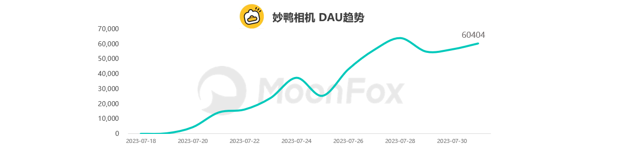 月狐iapp小程序版数据显示,妙鸭相机从7月17日上线到月底仅两周时间,就稳定有6万左右的活跃人数。