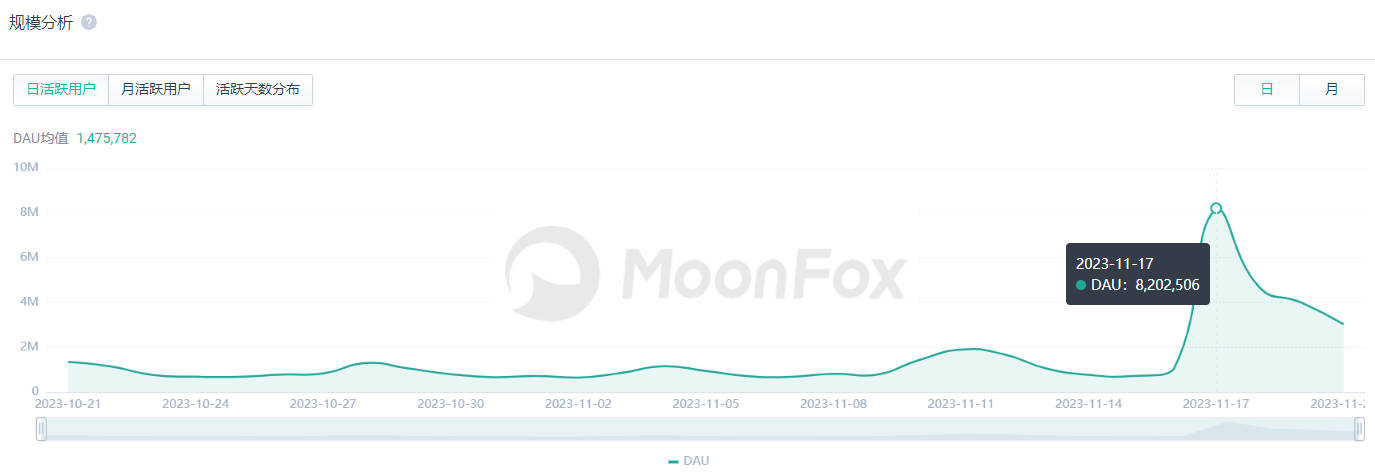 从月狐的小程序日活数据来看,营销效果也是十分显著。17号霸王茶姬日活用户达到峰值,超800万用户使用了小程序。后续几天各种免单活动也使小程序日活热度不减,高于平常日活量级。