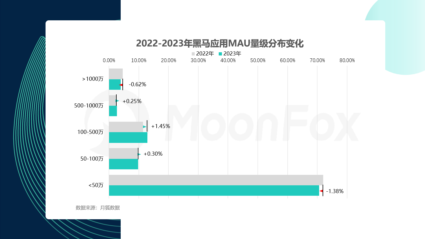 相比2022年,2023年的黑马应用在量级上更集中在中部的应用,其中月活跃用户数在100-500万区间的应用增长最多。