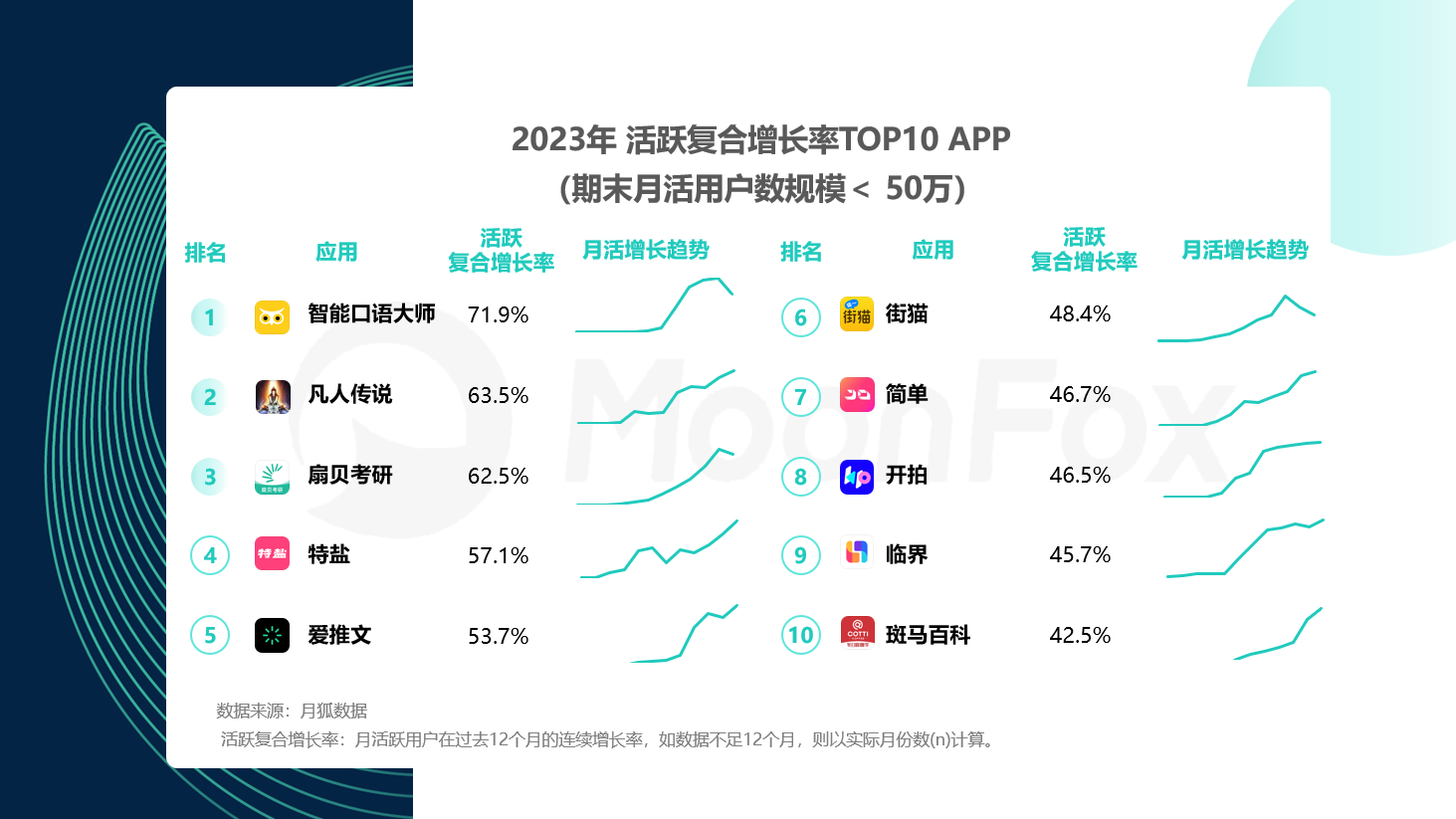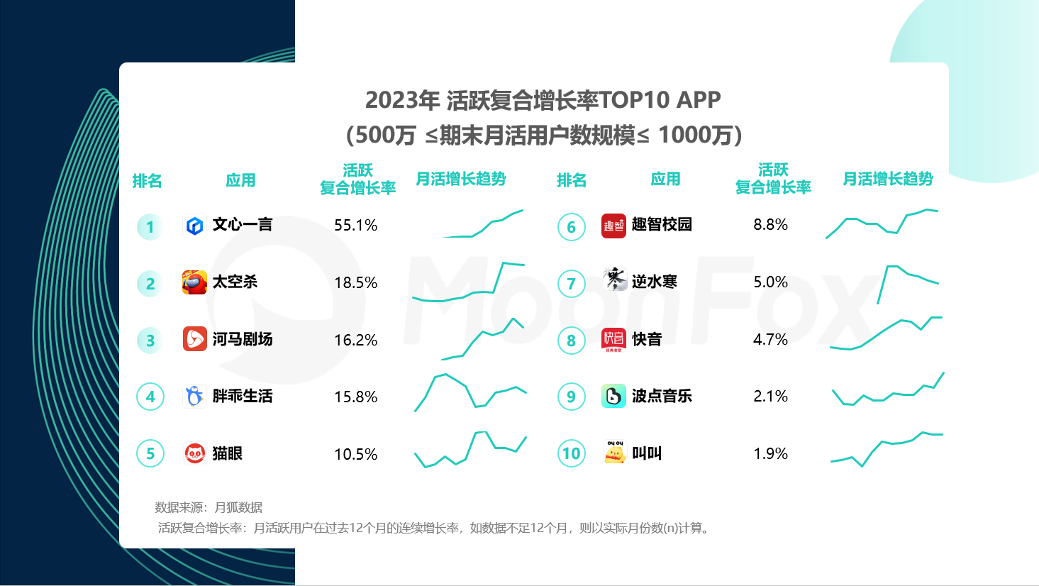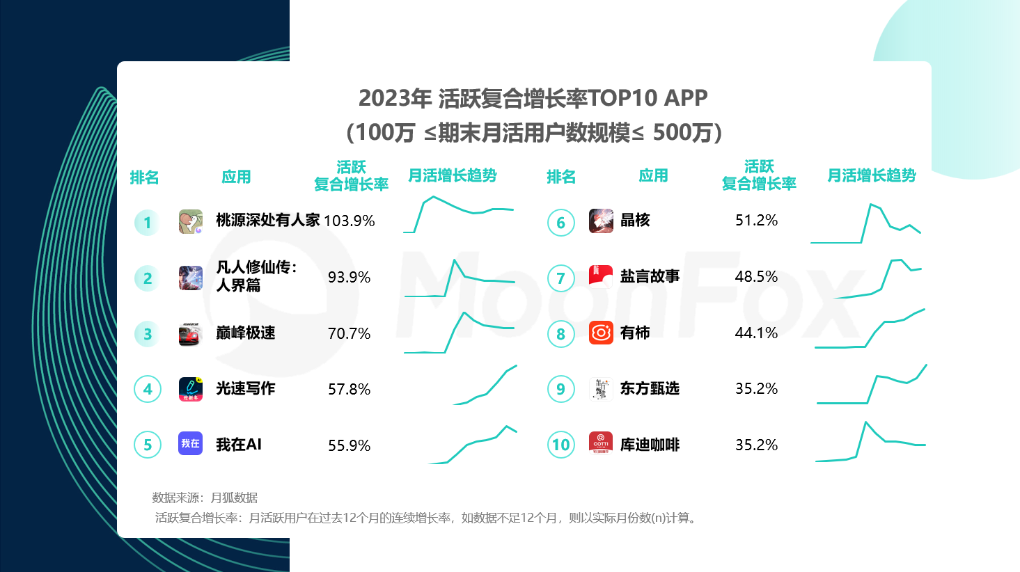 近期,月狐数据对2023年增长较快的黑马应用进行了大盘点。