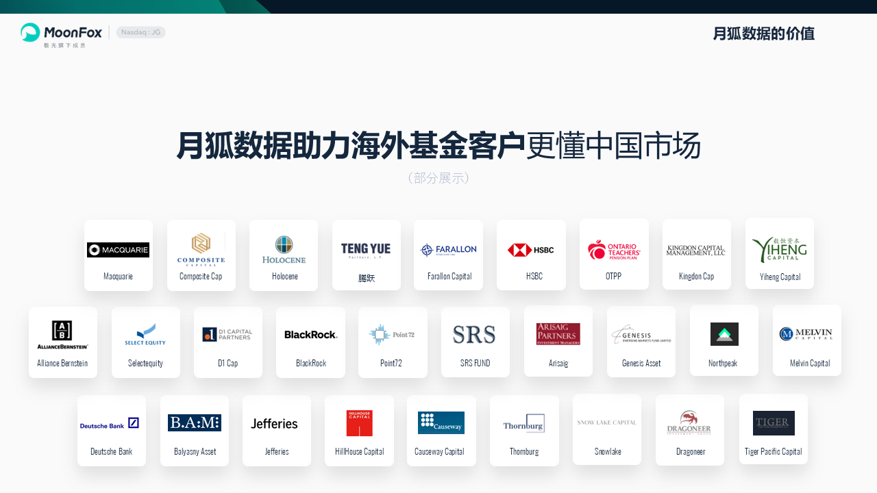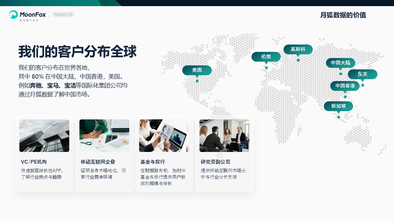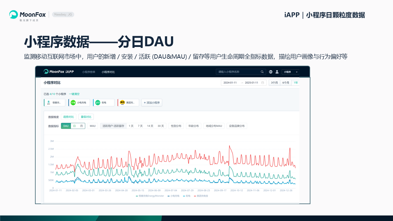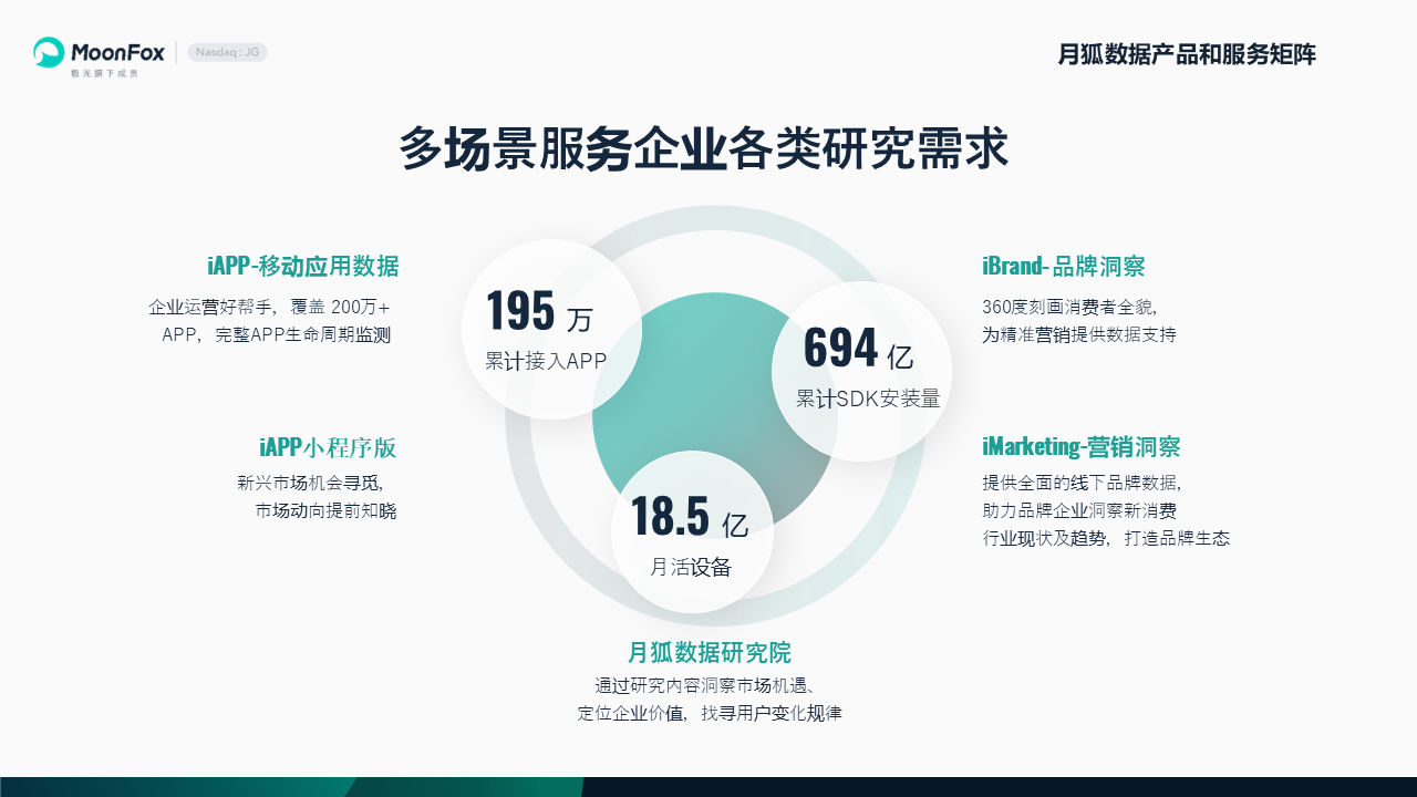移动应用数据-iAPP、品牌洞察数据-iBrand、营销洞察-iMarketing、全球移动应用数据-iAPP国际版等产品矩阵,以及月狐研究院的行业洞察服务,用数据帮助企业赋能商业决策,洞察市场全貌。