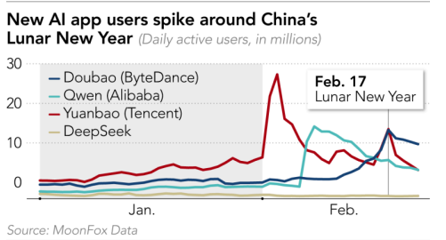 Platforms were quick to tout their holiday-season achievements. Qwen said this week that during the Spring Festival, its app helped users place nearly 200 million orders with "just one sentence." Doubao said last week that on Feb. 16 --Lunar New Year's Eve -- total interactions on the chatbot reached 1.9 billion, and the app helped users generate more than 100 million New Year greetings that day. Tencent, meanwhile, said Yuanbao's daily active users surpassed 50 million and its monthly active users reached 114 million.