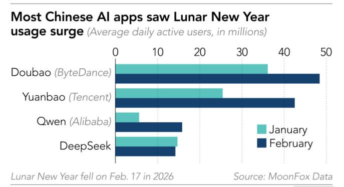 Among the four chatbots, Doubao continued to lead, thanks in part to ByteDance serving as the exclusive AI cloud partner for China Central Television's 2026 Spring Festival Gala, the biggest cultural event of the year watched by families across the country.