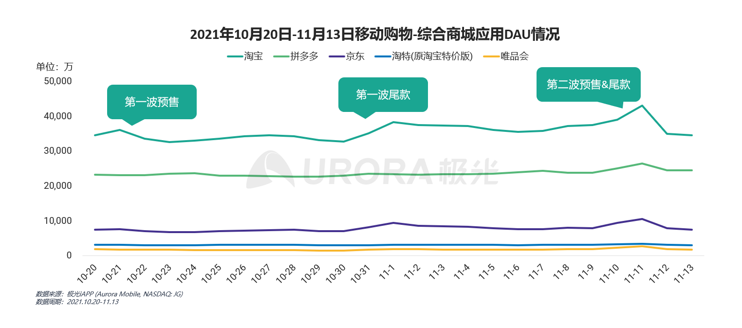 2021年双11成绩单出炉,根据公开数据整理,2021年11月12日零点,天猫双11总交易额定格在5403亿,截至11月11日23点,天猫有698个中小商家的成交额实现从百万级到千万级的跨越,78个去年双11成交额千万级的品牌,今年双11成交额突破了1亿元大关。截至11月11日23:59,京东11.11累计下单金额超3491亿元,31个品牌销售破10亿,Apple破百亿。在预售、尾款等关键时间节点,移动购物-综合商城行业的各应用活跃用户表现出明显的波动。
