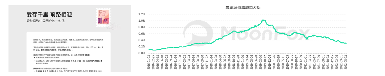 5月24日,在中国运营了近7年的爱彼迎正式宣布,将在2022年7月30日暂停支持中国境内游房源、体验及相关预定。
