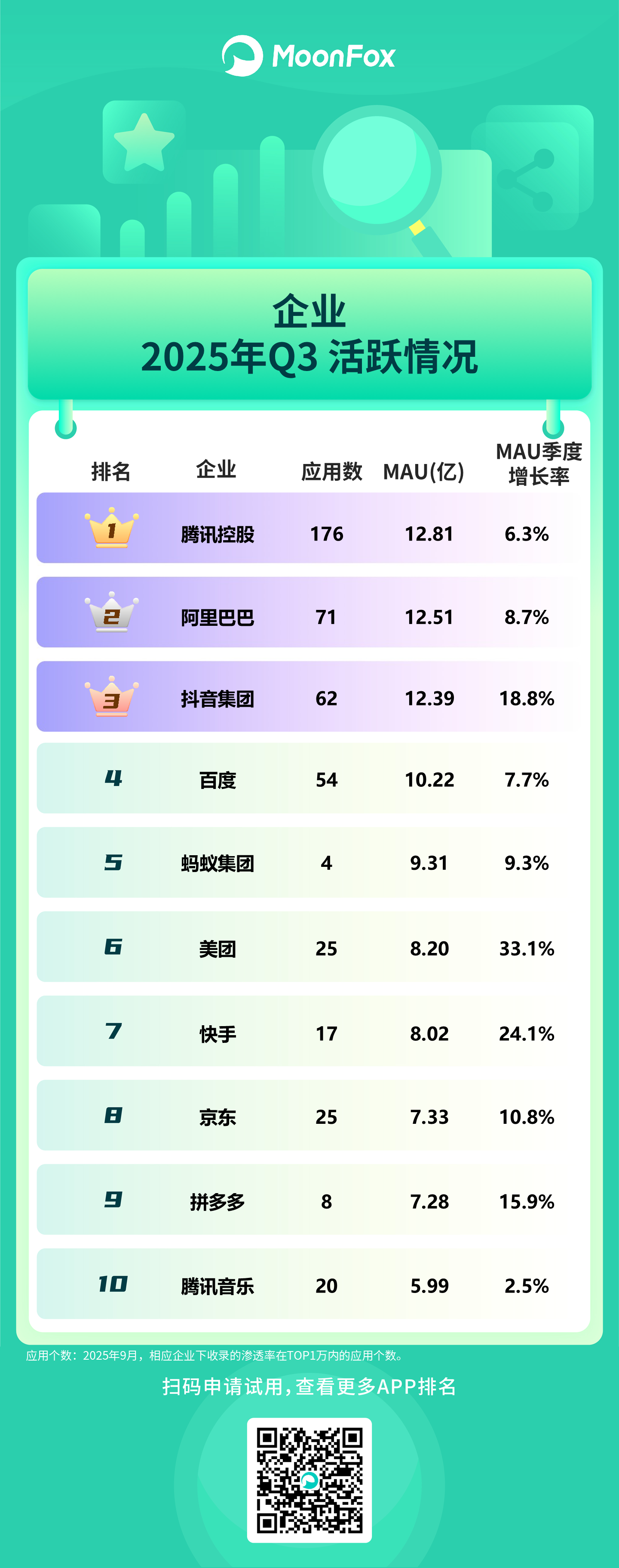 互联网企业: 腾讯控股以 176 个应用数和 12.81 亿 MAU 位居榜首,应用生态布局最广;阿里巴巴 MAU 达 12.51 亿,与腾讯竞争激烈;抖音集团 MAU 12.39 亿且季度增长率 18.8%,增长势头强劲。美团(33.1%)、快手(24.1%)等企业也保持较高增长速率,显示出不同领域的活力,而腾讯音乐 MAU 增长率仅 2.5%,增长相对乏力。整体来看,头部企业在用户规模和增长态势上各有优劣,行业竞争格局持续演变。