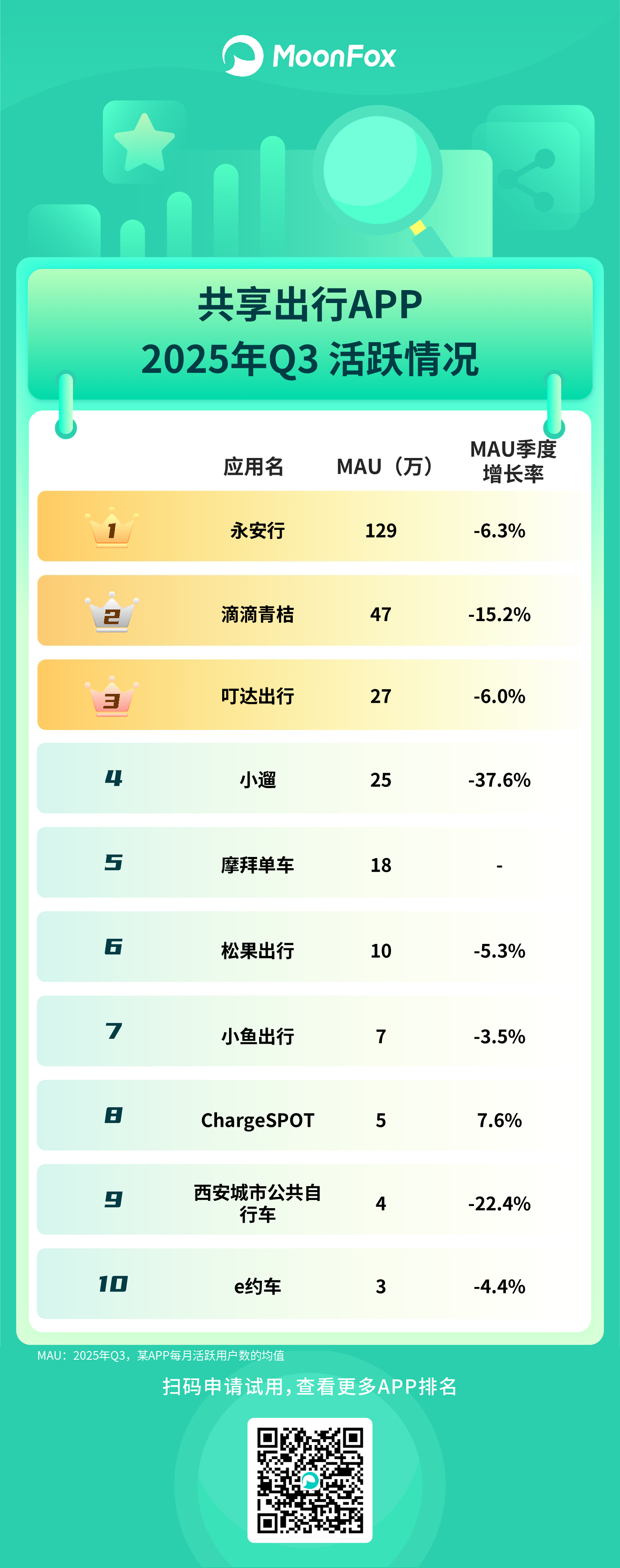 共享出行:多数应用 MAU 呈负增长,仅 ChargeSPOT 实现 7.6% 的增长;永安行 MAU 居首但下滑 6.3%,小遛下滑 37.6%。