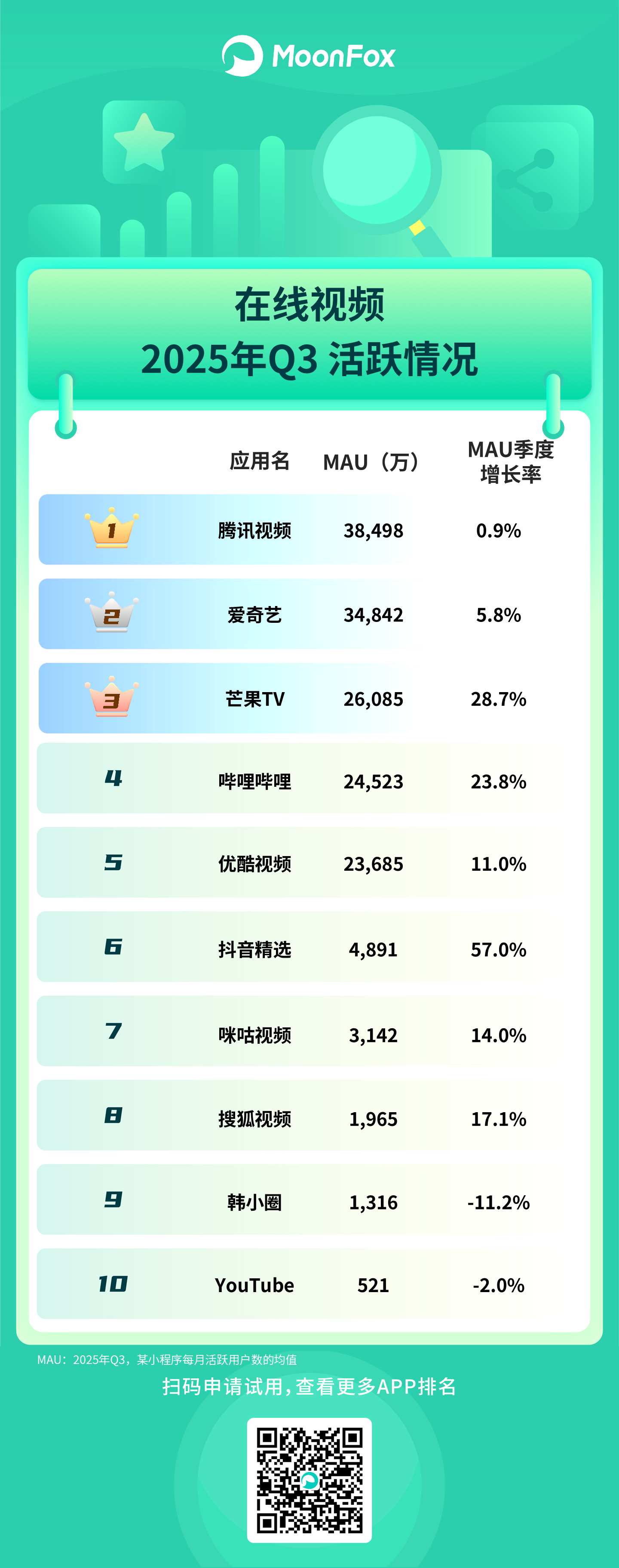 在线视频:腾讯视频 MAU 居首,爱奇艺、芒果 TV、哔哩哔哩等增长可观,抖音精选增长 57.0% 表现突出;韩小圈、YouTube 出现用户下滑。