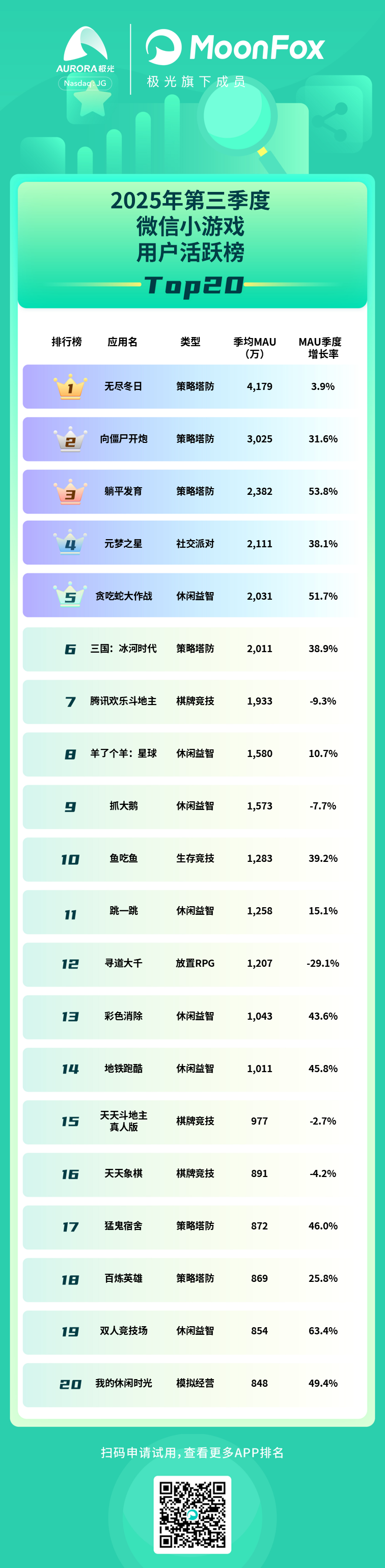 MAU:三季度微信小游戏MAU用户活跃榜中,策略塔防类表现突出,包揽前三且增长强劲,“躺平发育” 增长率达 53.8%;休闲益智类多款游戏增长亮眼;棋牌竞技类则普遍下滑。整体来看,策略塔防和休闲益智类小游戏势头正猛,传统棋牌类面临用户流失压力。