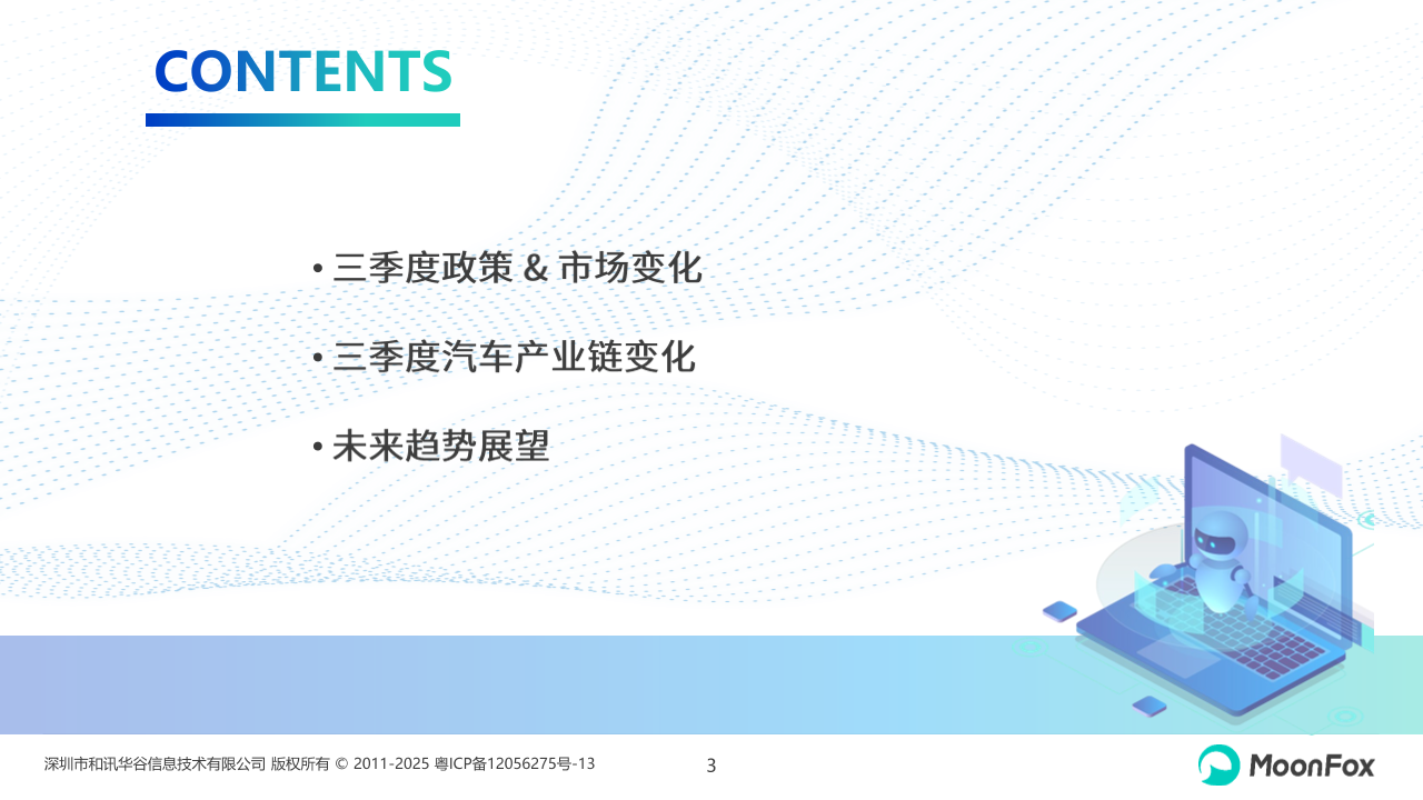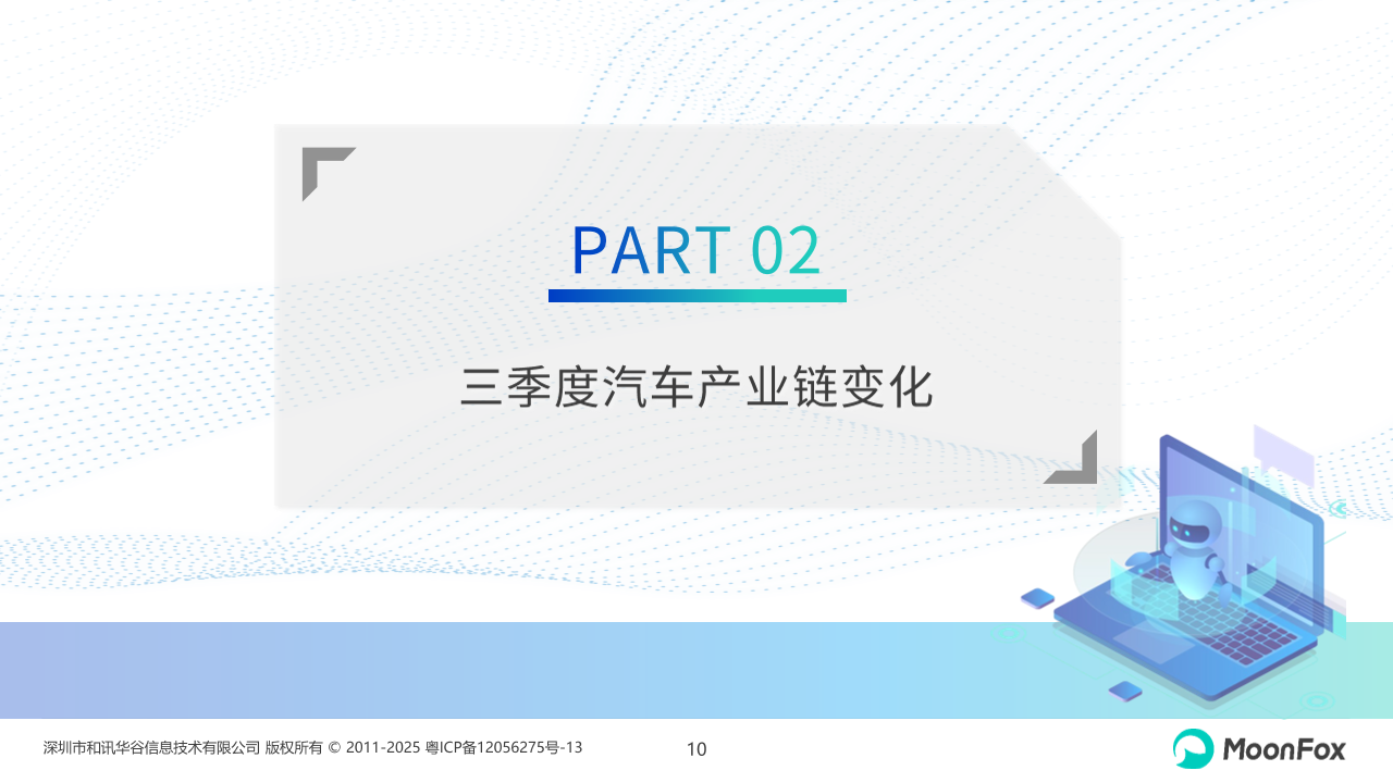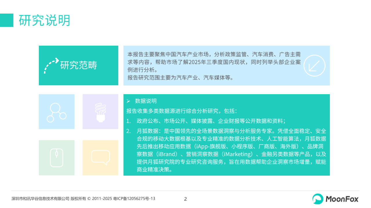 本报告主要聚焦中国汽车产业市场,分析政策监管、汽车消费、广告主需求等内容,帮助市场了解2025年三季度国内现状,同时列举头部企业案例进行分析。报告研究范围主要为汽车产业、汽车媒体等。