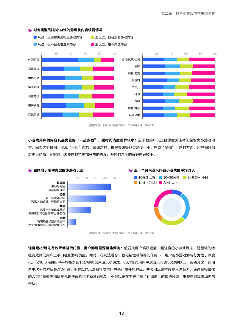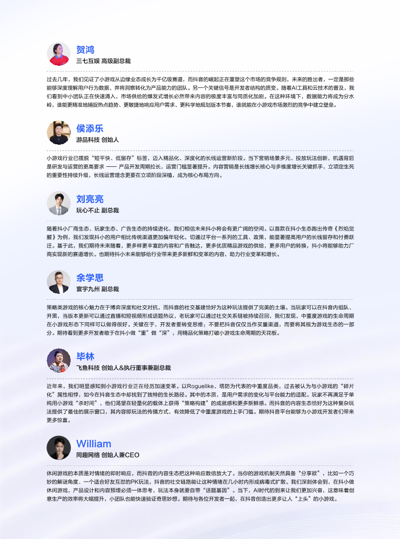 总体来看,小游戏行业正逐步迈入加速发展的新阶段,玩法及品类日趋丰富、玩家社交/互动意愿增强。未来,如何围绕抖音小游戏生态实现营销侧的长线运营和持续获客,是小游戏企业于行业脱颖而出的关键。