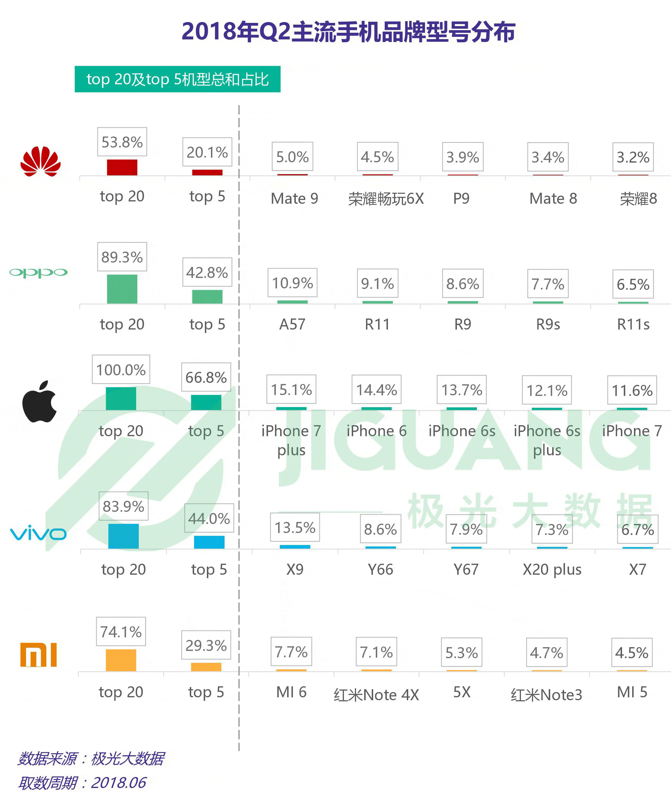 极光大数据显示,2018年3月底发布的OPPO R15成为Q2销量占比最高的机型,vivo X21和OPPO R11s分别居于二、三位